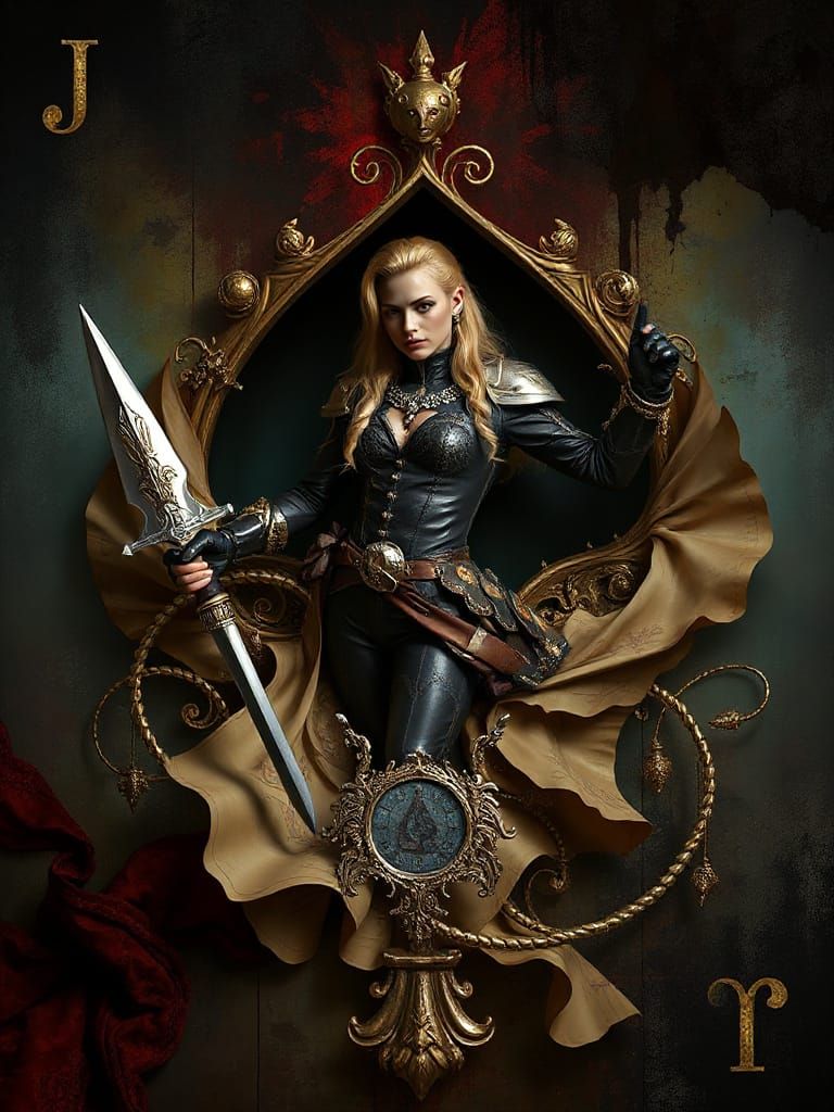 This image shows a heroic Jack of Spades as a 3D playing card, emerging from an abstract background. Rendered with cinematic lighting and painterly realism, it features intricate details and a subtle fantasy aesthetic.