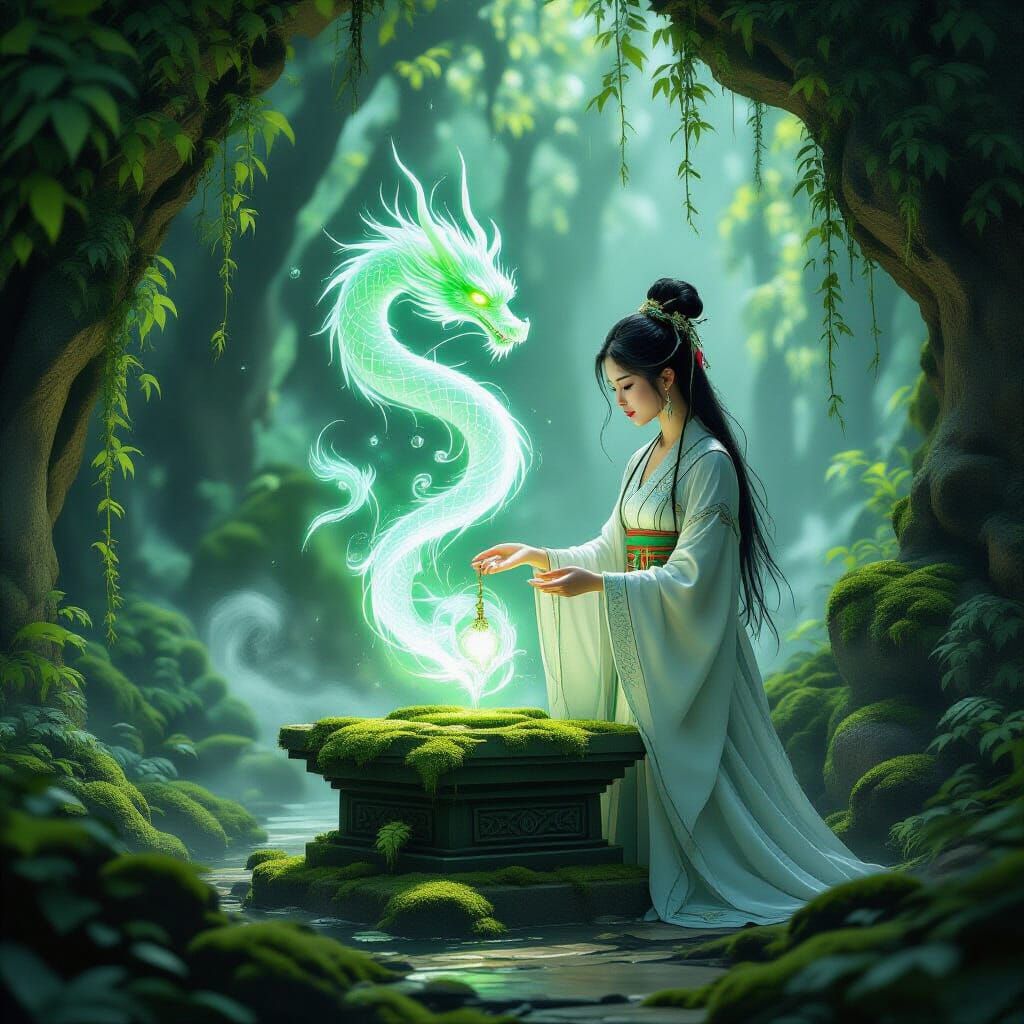 This image shows a figure in silk robes placing a jade dragon pendant on an altar. A shimmering jade dragon appears above, illuminating the grotto in a mystical light in a whimsical, otherworldly style.