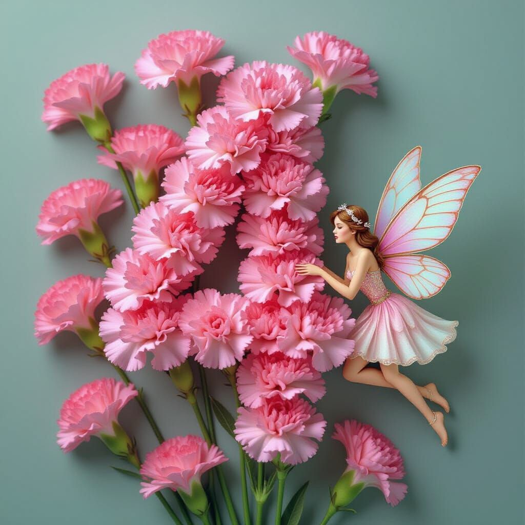 This image features the number '4' meticulously crafted from delicate pink carnations, accompanied by a beautiful, ethereal fairy.