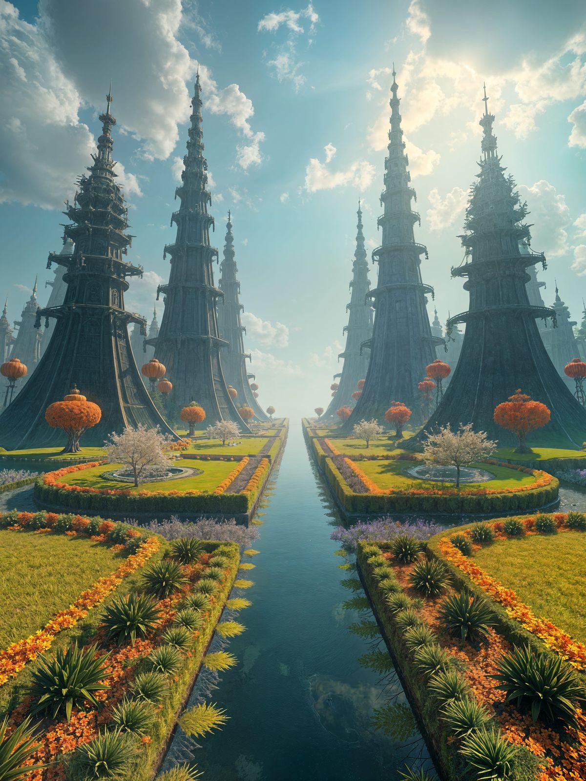 This image shows a psychedelic wonderland scene rendered in high resolution. The symmetrical composition and vibrant colors create a mesmerizing and immersive digital art experience.