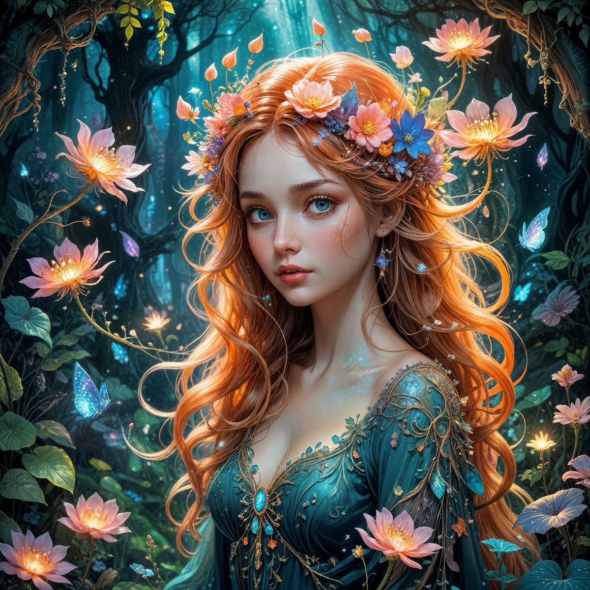 This image shows a magical plant-like being with floral hair, growing in a vibrant, bioluminescent fairy forest. Rendered as a detailed ink and watercolor painting with a warm, dreamy aura.