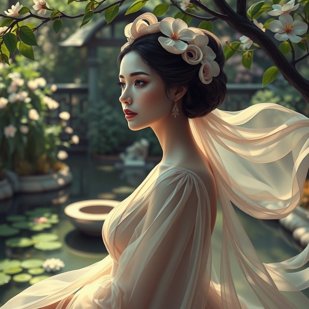 This enchanting film-style illustration features a beautiful woman with delicate, flower-like features, set against a serene garden backdrop with a tranquil pond and lush greenery. Her elegant, flowing gown and intricate headdress evoke a sense of refined elegance and sophistication, with a touch of fant...