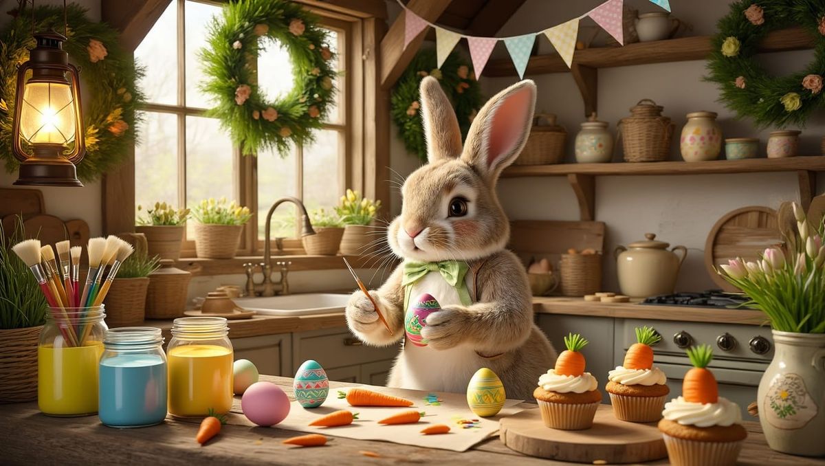 This charming image shows the Easter Bunny busy preparing for the holiday in a warm and inviting rustic cottage kitchen. The scene is filled with springtime decorations, colorful paint, and sweet treats, all bathed in soft golden light.