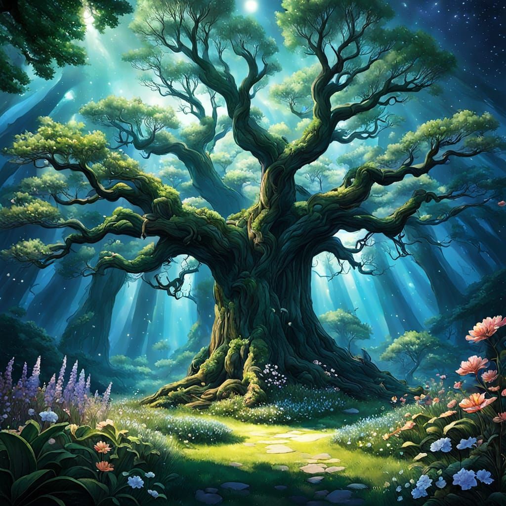 A vibrant artwork showcasing radiant flowers, ancient trees, and shimmering wildlife. The scene embodies a biophilic design, blending nature and art in a harmonious composition.
