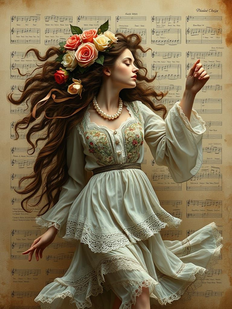 This image shows a dreamy, bohemian woman lost in dance, surrounded by roses, lace, and pearls, set against a soft music paper background with intricate patterns and organic tones, reminiscent of the romantic styles of Camille Rose Garcia and Brian Froud.