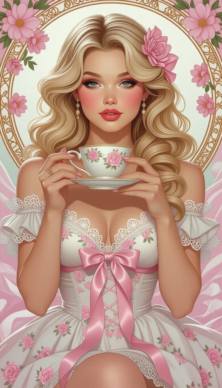 A captivating image of a curvy, blonde woman in a floral sundress. The scene evokes a dreamy, ethereal feeling with delicate lighting and intricate textures in an art nouveau style.