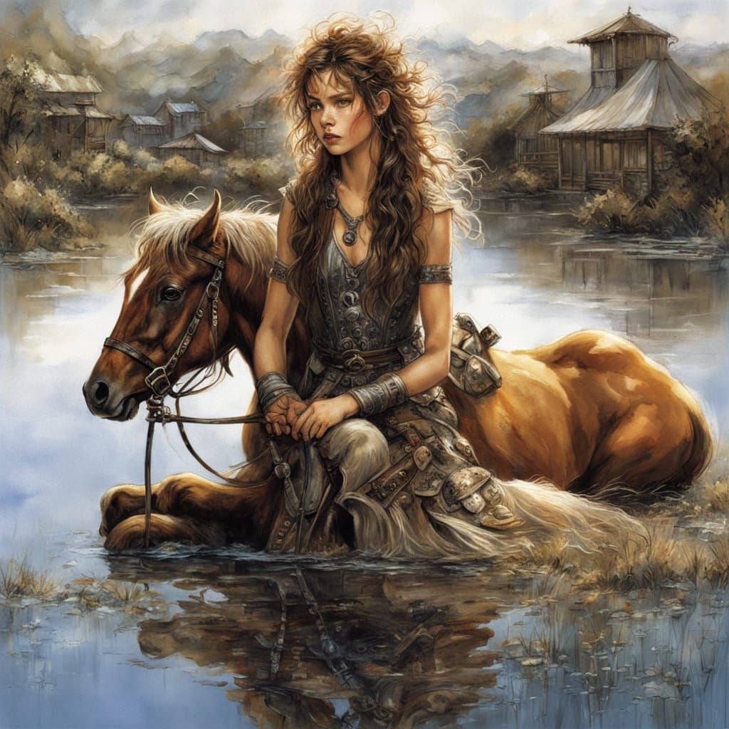 This image shows a beautiful young girl with curly hair and golden-brown eyes, standing next to a Shetland pony. The soft landscape is rendered in a beautiful deep watercolor style.