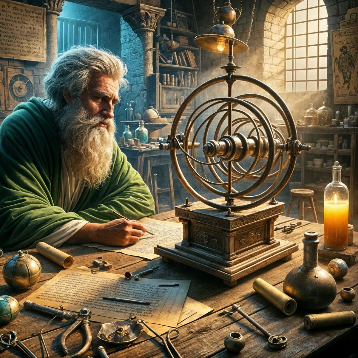 This hyperrealistic concept art shows Heron of Alexandria observing a steam-powered eolipile in his ancient workshop. Detailed with dramatic lighting and a colorful background, it captures a pivotal moment in invention.