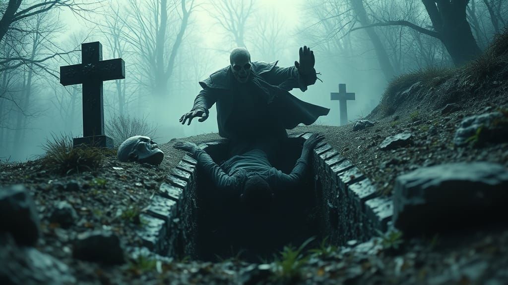 A hyperrealistic image showing a person falling into an open grave, pushed by a ghostly figure. The scene features intricate details, cinematic lighting, and high contrast in a dystopian style.