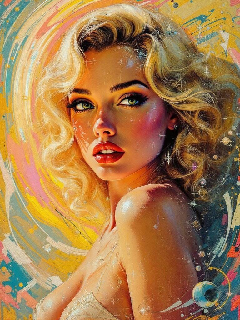 This image presents a 1950s pin-up woman with bold eye contact. Blending luminous, sensual qualities with dynamic brushstrokes and retro-cyberpunk elements, the artwork features textured paint waves and neon scan lines.