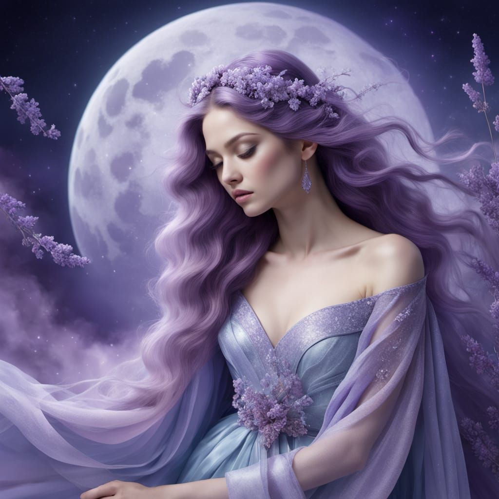 This image shows a mystical woman in flowing robes standing before a glowing moon with intricate celestial patterns. Soft, ethereal lighting and iridescent textures create a dreamy, luxurious atmosphere, evoking a sense of refined elegance and artistic beauty.