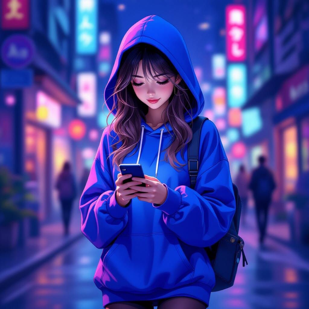 This image shows a young woman in an oversized cobalt blue hoodie and tights, engrossed in her phone. Rendered in a vibrant anime digital art style with dynamic lighting.
