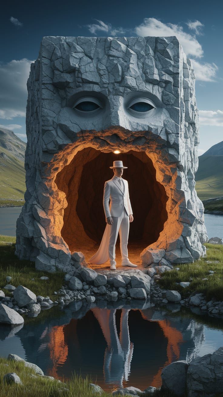 This image shows a surreal figure in a suit, head replaced by a sculpted rock containing a golden-lit cave and lake. The background features a water and hill landscape, rendered as high-definition digital art.