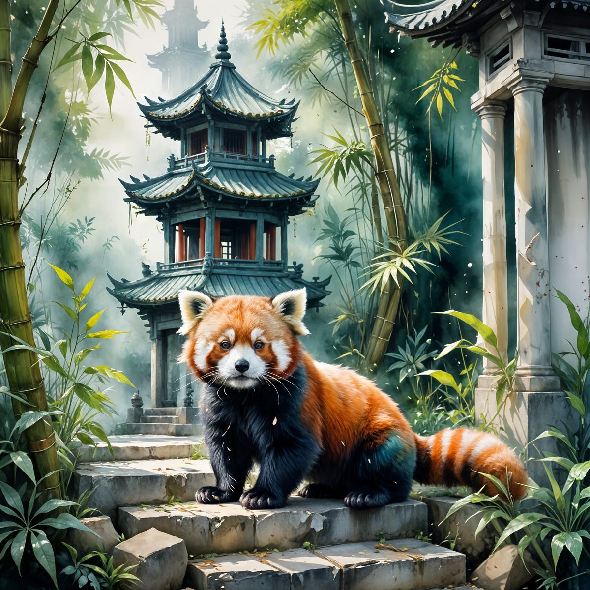 A vibrant image of a red panda exploring a bamboo garden. Sunlight filters through the emerald stalks, illuminating a stone pagoda in a watercolor style with expressive linework.