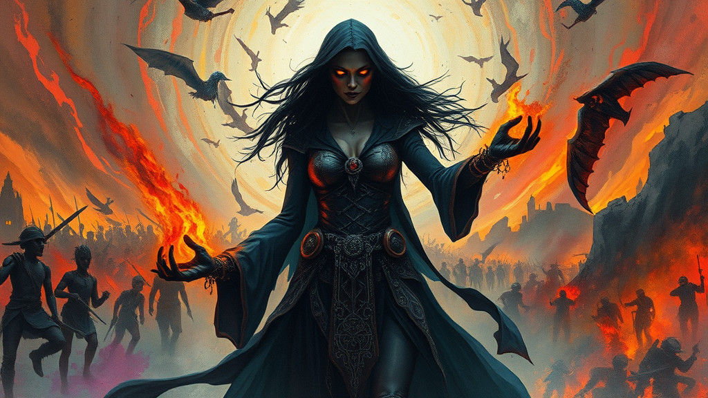 A striking picture of a sorceress wielding magic. Distant battles rage in the background of this ultra-detailed image rendered with impasto textures, surrealist influences, and heavy metal cover art motifs.