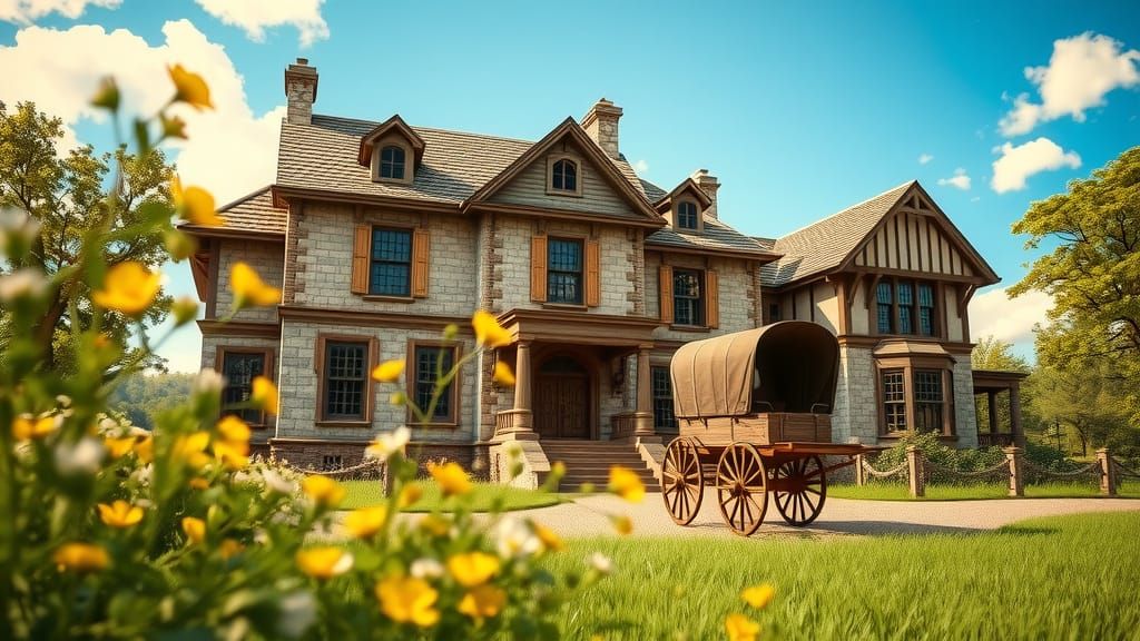 This serene image shows a majestic, 19th-century mansion surrounded by vibrant flowers and a classic wooden horse-drawn wagon, crafted in a unique papercraft aesthetic with intricate details and soft focus.