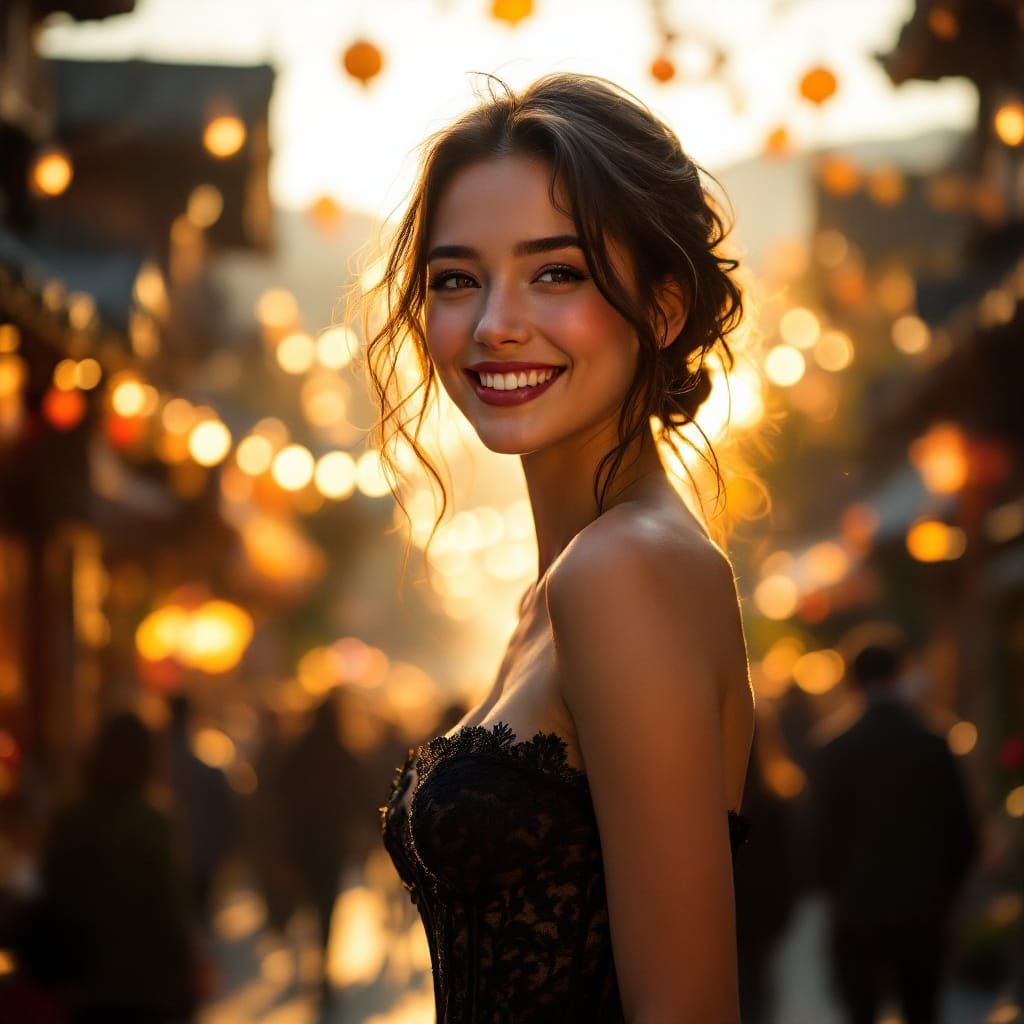 This image features a woman in an elegant black lace dress smiling at sunset. Captured with soft golden light and bokeh, it evokes a warm, emotive, and timeless cinematic feel.
