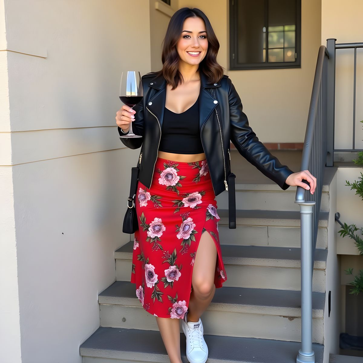 A young woman, dressed in a black cropped top, leather jacket, and red floral skirt, sits on a staircase, holding a wine glass and exuding confidence and relaxation. The warm, natural lighting and predominantly warm color palette create a cozy ambiance.