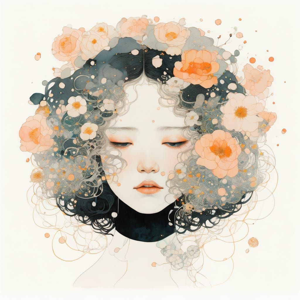 This image showcases a close-up of a single, pale peach flower with exceptional micro details, reminiscent of the ornate styles of Gustav Klimt and the dreamy realism of Yoshitaka Amano, with a subtle nod to Conrad Roset's delicate illustrations.