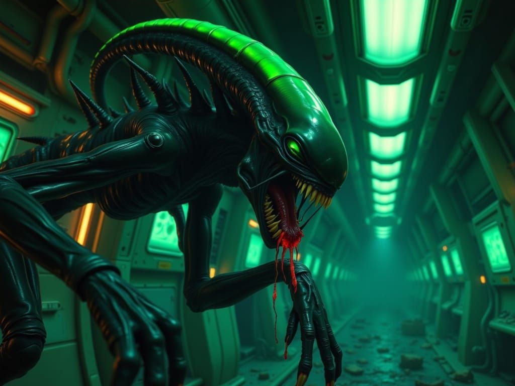 This striking image depicts a Xenomorph consuming the word 'bully' in a dimly lit, claustrophobic spaceship. Features bioluminescent details, glowing eyes, and deep colors, reminiscent of H.R. Giger's style.