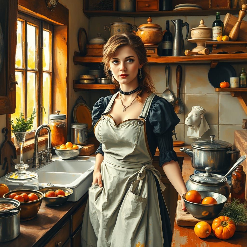 A detailed charcoal drawing of Belle in a French kitchen filled with vintage utensils. The artwork blends gouache and watercolor styles with thick brush strokes and layered textures.