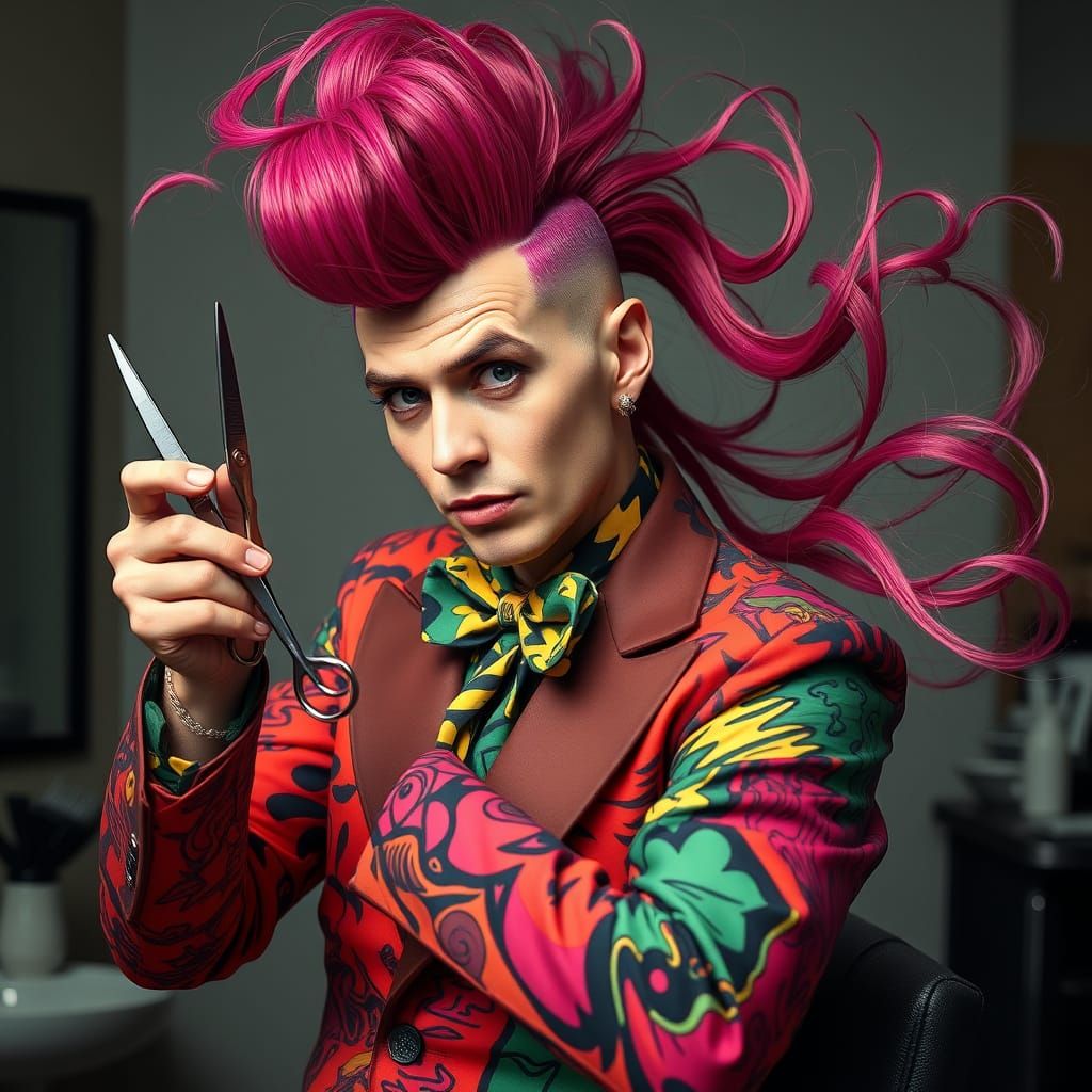 A vibrant image of a flamboyant hairdresser cutting hair. The style features bold lines, vibrant colors, and exaggerated features in a neo-expressionist aesthetic.