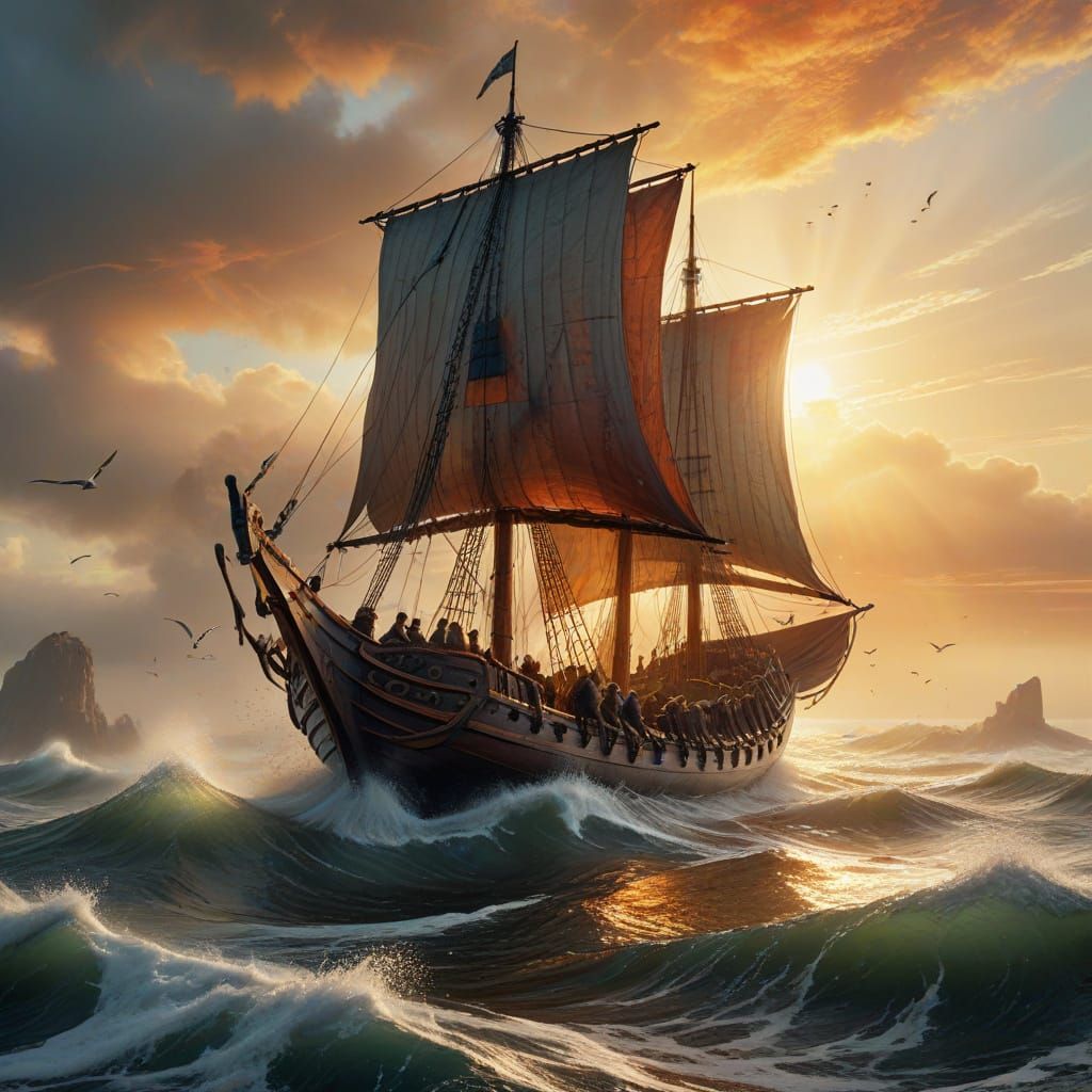 This image shows a majestic Viking longship emerging from a misty dawn, surrounded by armed warriors and set against a backdrop of crashing waves and soaring seagulls. The watercolor art features dynamic brushstrokes, soft color gradients, and intricate detailing, with a warm and inviting color palette.