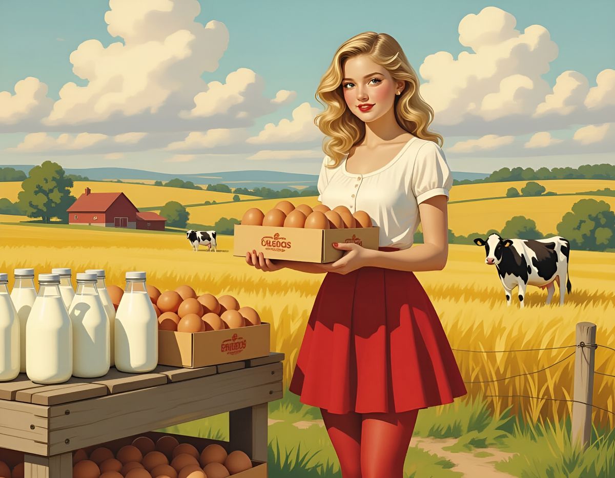 A vibrant painting of a young woman at her farm stand, offering fresh milk and eggs. This image is reminiscent of impressionistic oil paintings, with visible brushstrokes and bright colors, depicting a sunny day on the farm.