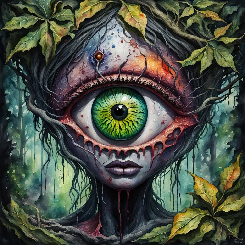 A striking picture of a grotesque slime girl with an eyeball head, composed of trees and natural elements. This watercolor image is rendered with thick brushstrokes in an impressionistic style.
