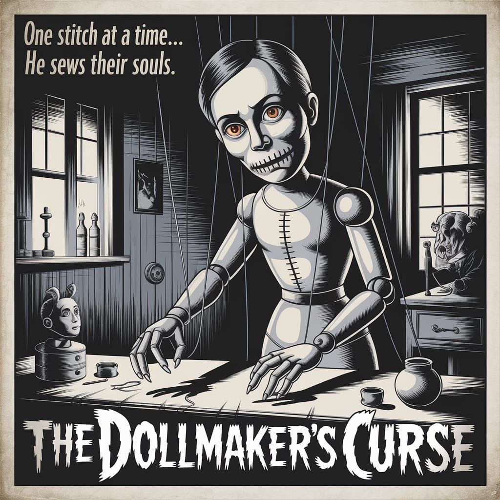 A vintage horror movie poster featuring a twisted marionette in a shadowy workshop. The monochrome image evokes a German Expressionist style with a yellowed paper effect.