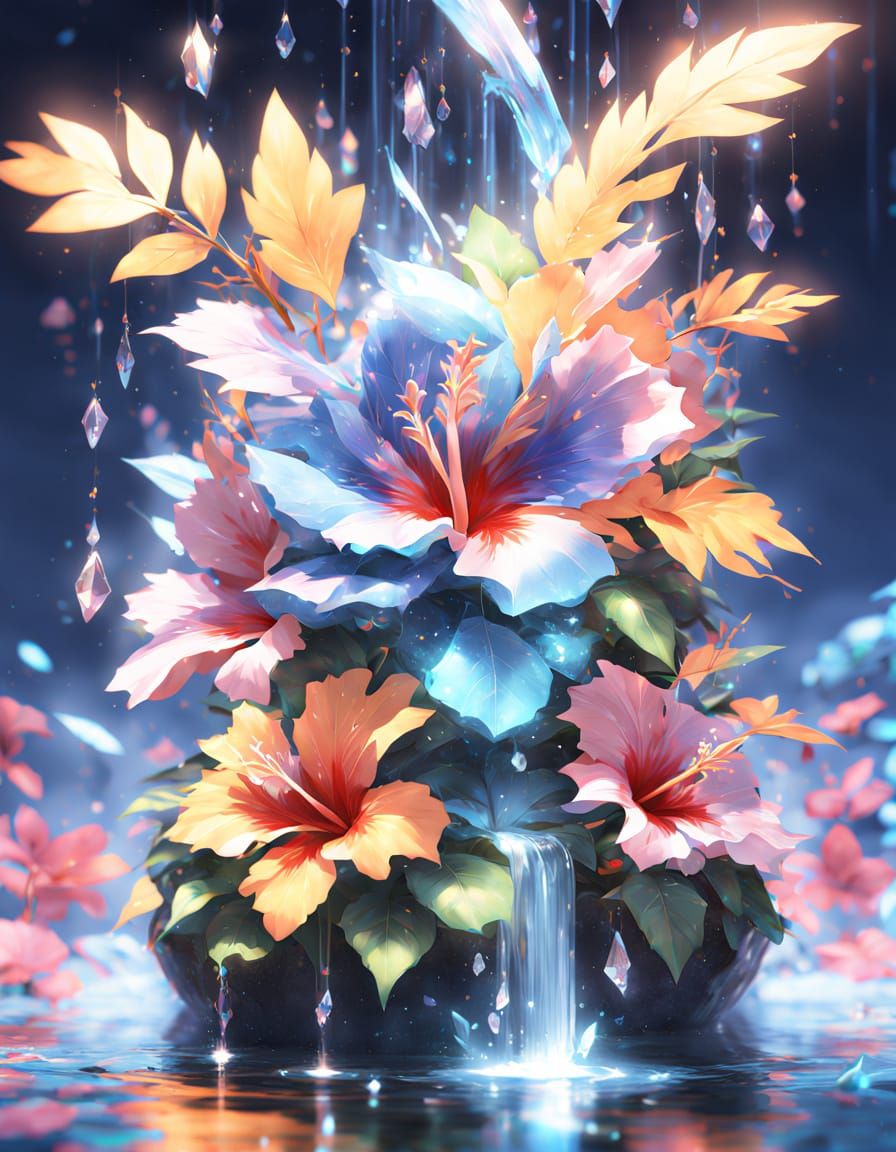 This image features a stunning waterfall of shiny crystal flowing into a pool, surrounded by vibrant rainbow hibiscus flowers. Rendered in a hyperrealistic anime style with prismatic highlights and ultrafine detail.