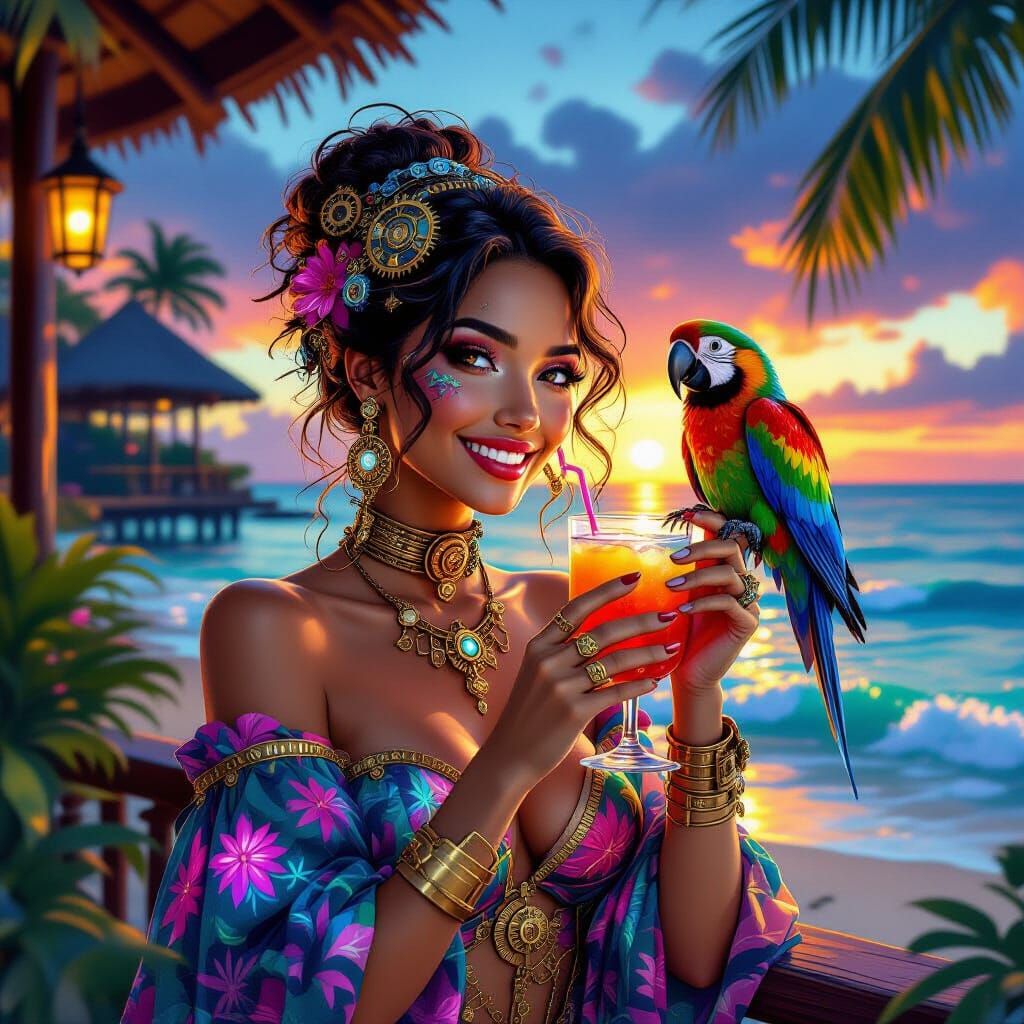 A woman enjoys a tropical drink at a sunset resort, wearing a unique outfit blending Art Nouveau and steampunk styles with graffiti accents. The scene features a mechanical parrot and bioluminescent waves, rendered in vibrant cyber-fantasy art with neon and metallic details.