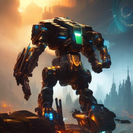 mecha, large humanoid machine; a masterpiece, 8k resolution, dark fantasy concept art, by Greg Rutkowski, dynamic lighting, hyperdetailed, intricately detailed, Splash screen art, trending on Artstation, deep color, Unreal Engine, volumetric lighting, Alphonse Mucha, Jordan Grimmer, purple and yellow ...