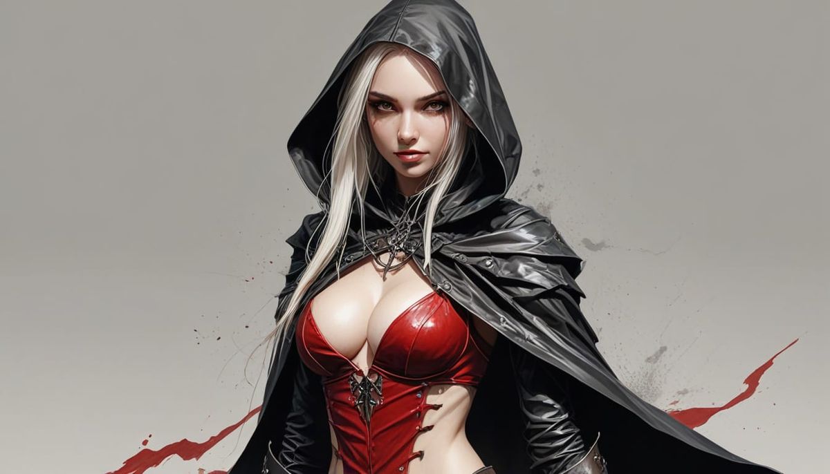 This image shows a female elf vampire in a hooded cloak. She is depicted from the back, with blond hair and a venomous smile, in a dark red and grey ink drawing.