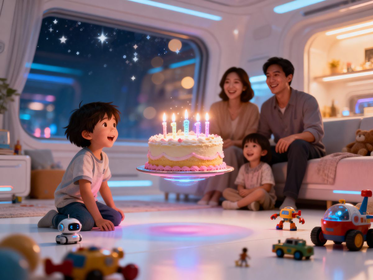A tender, nostalgic scene of a child's birthday in 2085, featuring a levitating cake and holographic candles. Captured with cinematic realism and a warm, glowing color palette.