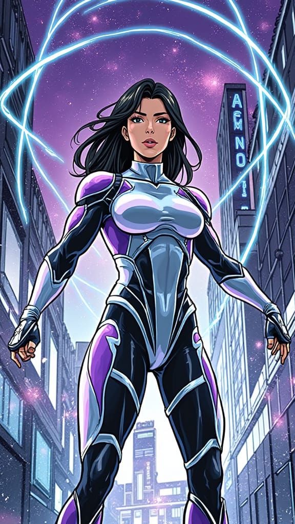 This image depicts an animated female bodybuilder with long black hair, wearing a purple and white Silver Surfer-inspired costume against a vibrant Tron Cityscape. The artwork features dramatic lighting and an electric color palette.