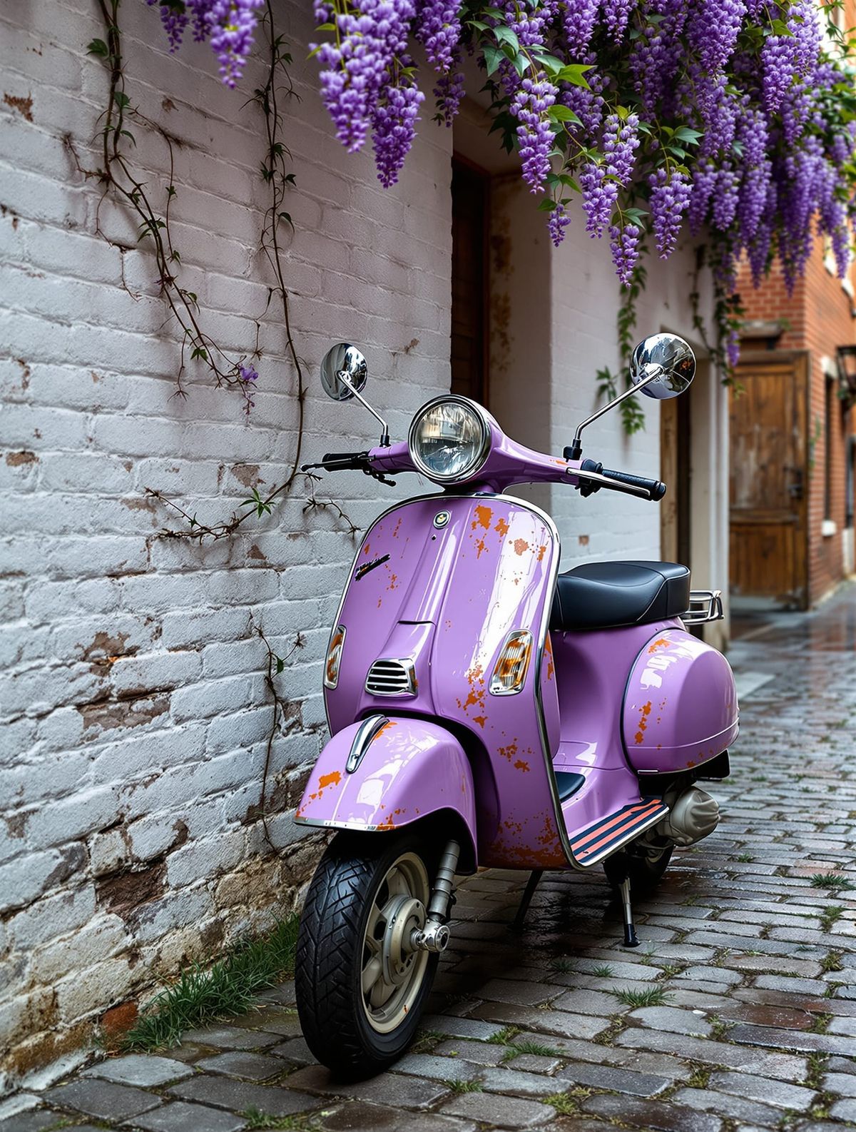 A vintage purple Vespa scooter with a chrome headlight rests against a brick wall in a narrow, wet cobblestone alley. Purple wisteria blooms overhead, creating a romantic, photorealistic scene with soft, diffused lighting.