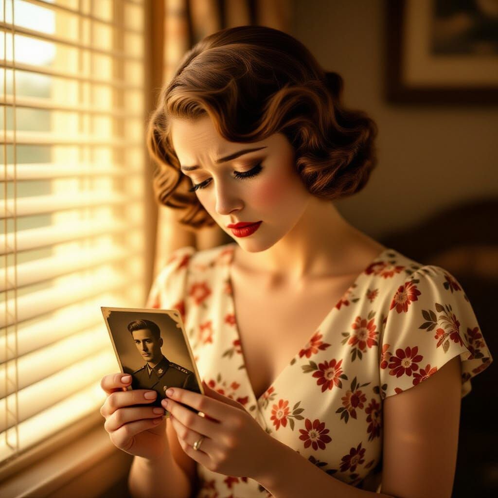 This image shows a sorrowful woman in the style of the 1930s, holding a sepia photograph. Golden lighting and soft shadows evoke a vintage, nostalgic atmosphere, reminiscent of early cinematic techniques.