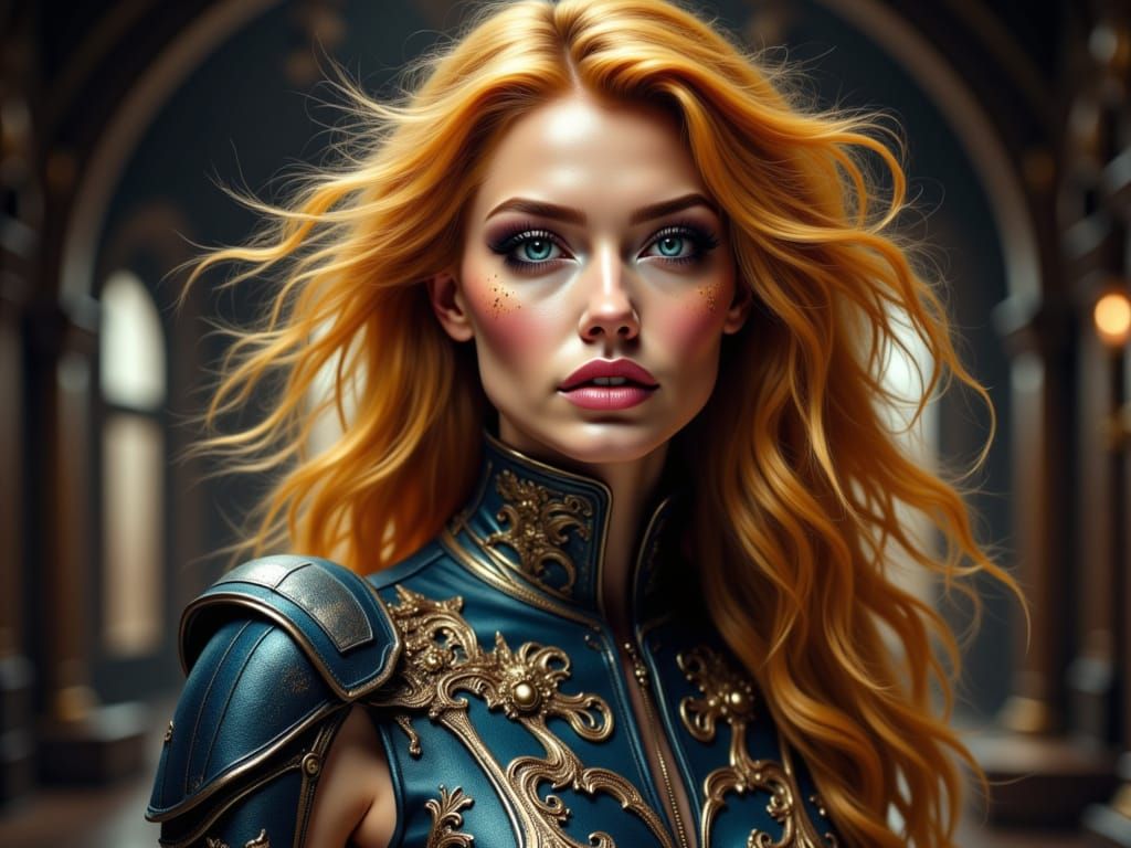 This image features a full-body depiction of a seductive woman with a hyper-expressive face, rendered in vibrant pink, amber, yellow, teal, copper, and blue-steel tones. The artwork displays intricate details and perfect anatomy.