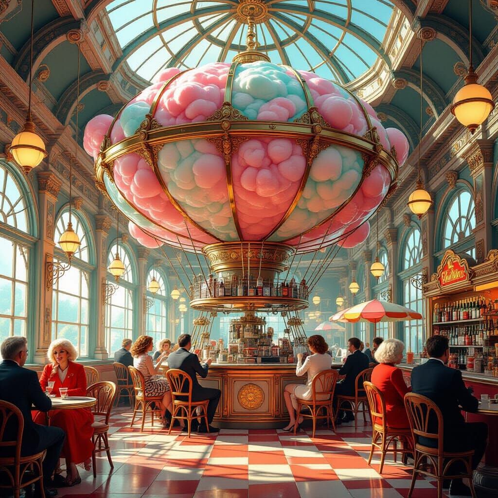 This image shows a vintage advertisement for a 1950s fantasy cotton candy shop in an airship. The image is hyperdetailed with dynamic lighting and an art nouveau aesthetic, in orange and teal hues.