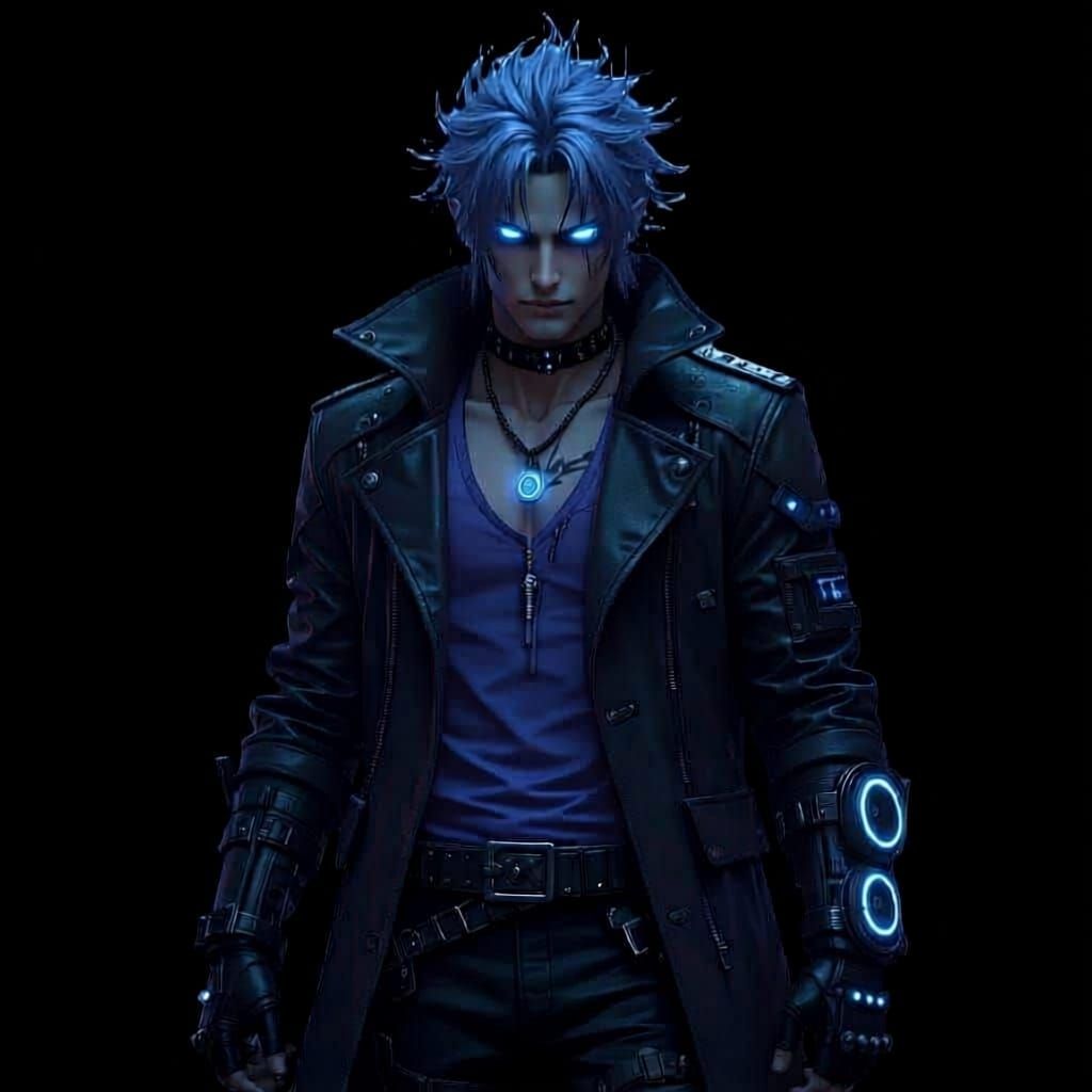 This image depicts a male kemonomimi character, a vampire mage with shark-like features. He sports cybernetic augmentations, glowing crimson eyes, and wears a tattered cyber-mage coat with neon circuitry.