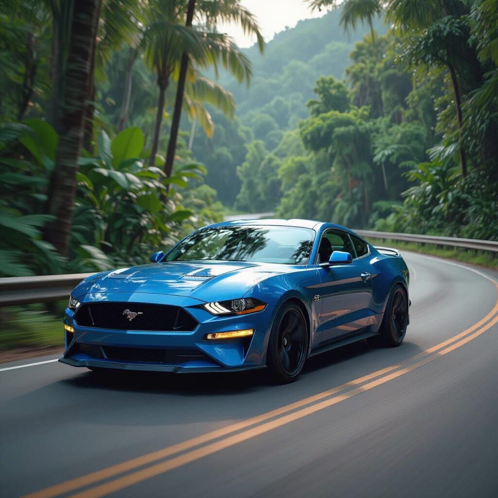 This image shows a metallic blue Ford Mustang Boss speeding down a jungle road. The scene features vibrant colors and dramatic lighting, creating a cinematic aesthetic.