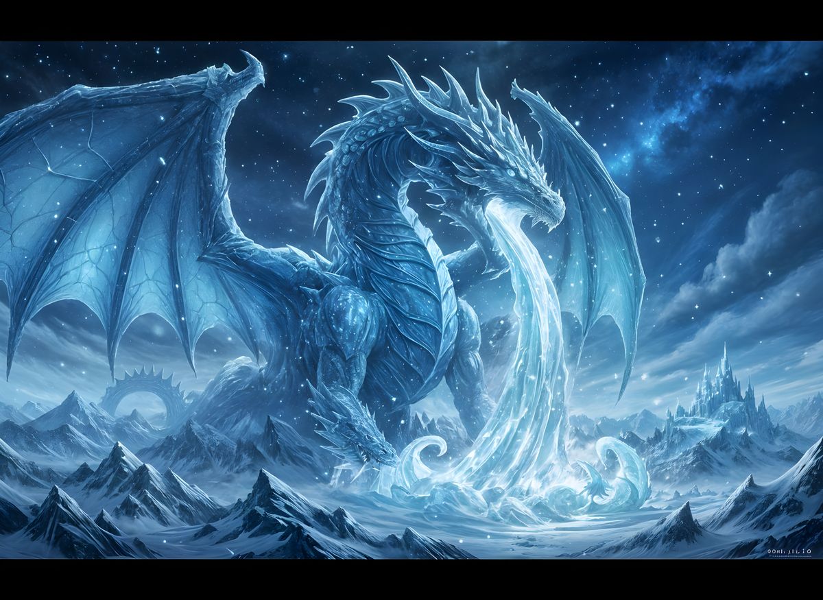 A highly detailed digital painting of an epic ice dragon sculpture exhaling mist atop snowy mountains under a starry sky. Features volumetric lighting and atmospheric perspective for a cold, majestic feel.