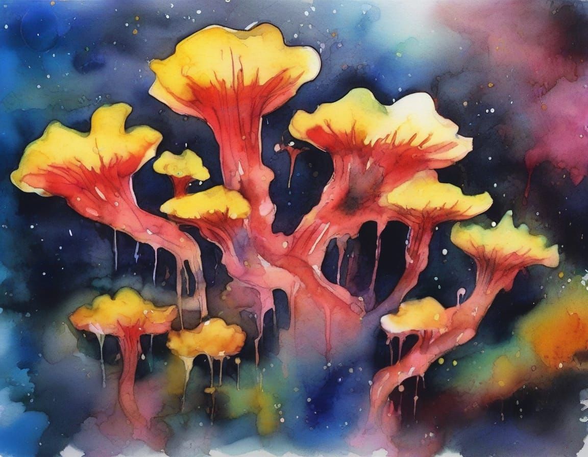 This image shows a vibrant, glowing underwater neighborhood nestled within coral reefs and sea caves. Created with expressive brushstrokes, the artwork features bioluminescent accents in a whimsical and dreamy style.
