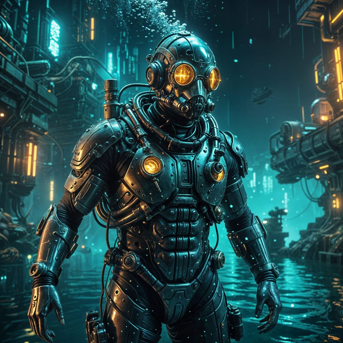 A digital rendering of a diver in a futuristic suit exploring an underwater city. The city blends industrial and steampunk elements in a cyberpunk aesthetic.