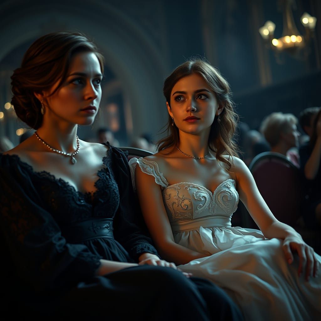 This image shows two sisters with conflicting emotions in a dramatic, cinematic scene. The image is highly detailed with sharp focus, high contrast, atmospheric lighting, and hyperrealistic HDR.