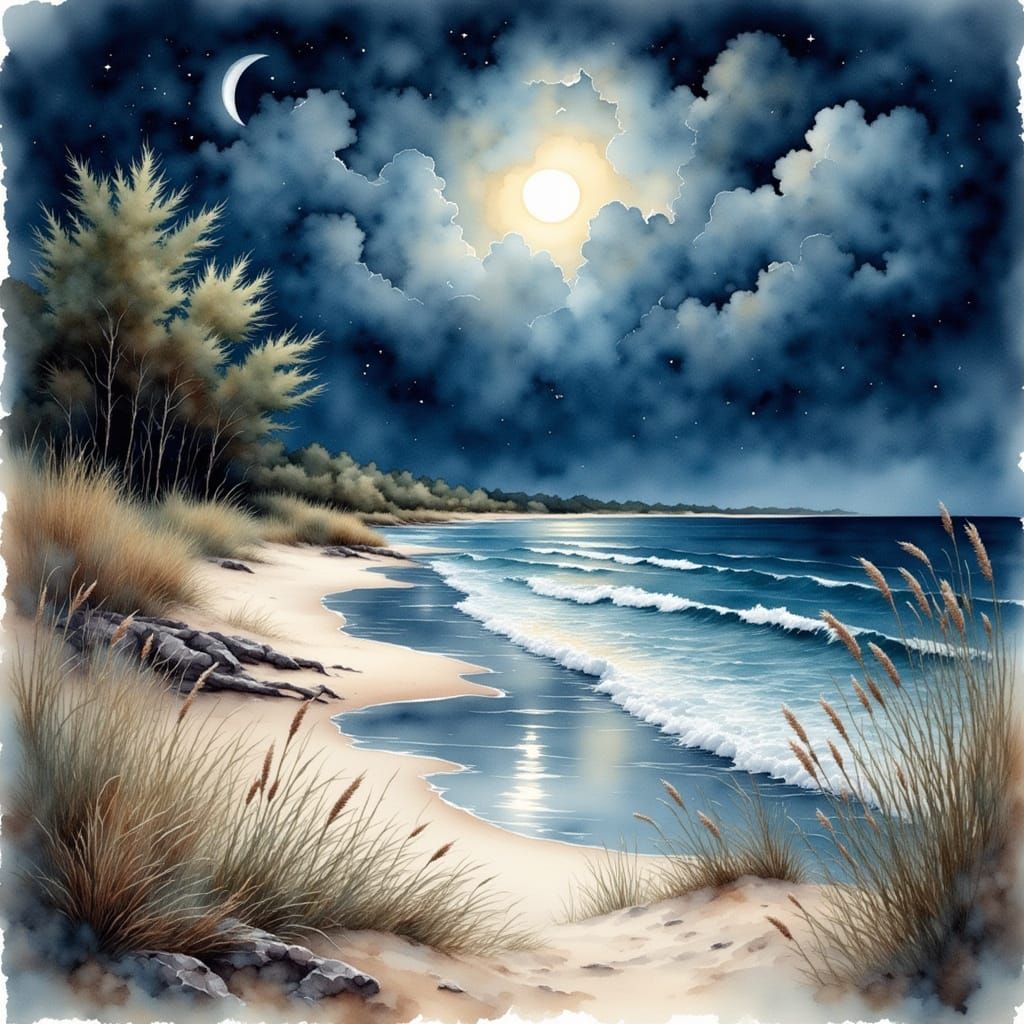 This image shows a serene beach scene under a moonlit night sky. The artwork is rendered in a soft, natural, antique watercolor style with a gritty, grunge texture.