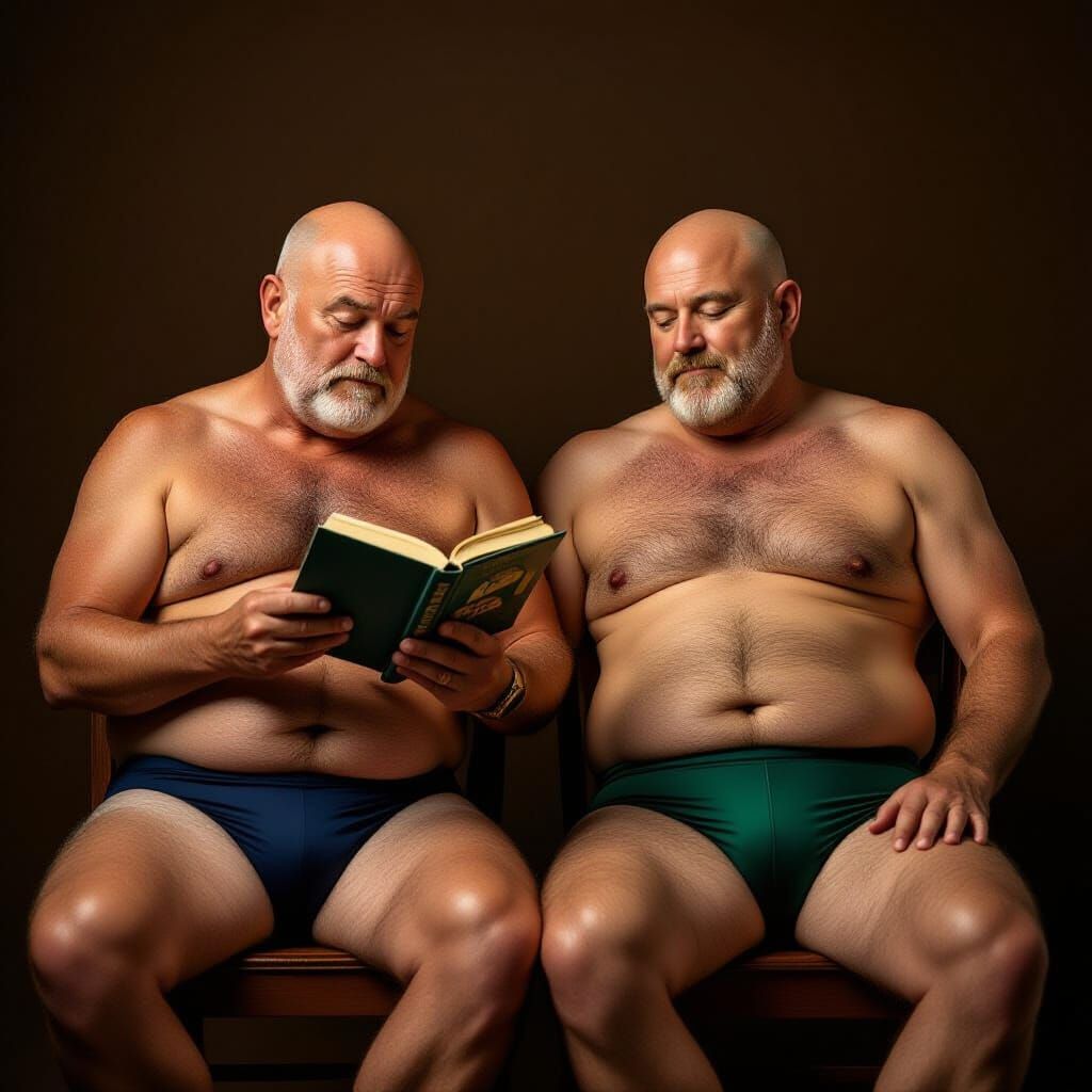 This image shows two older, bald men in speedos. One man reads a book as the other dozes off in a heartwarming, intimate moment against a dark brown background, captured with warm tones.