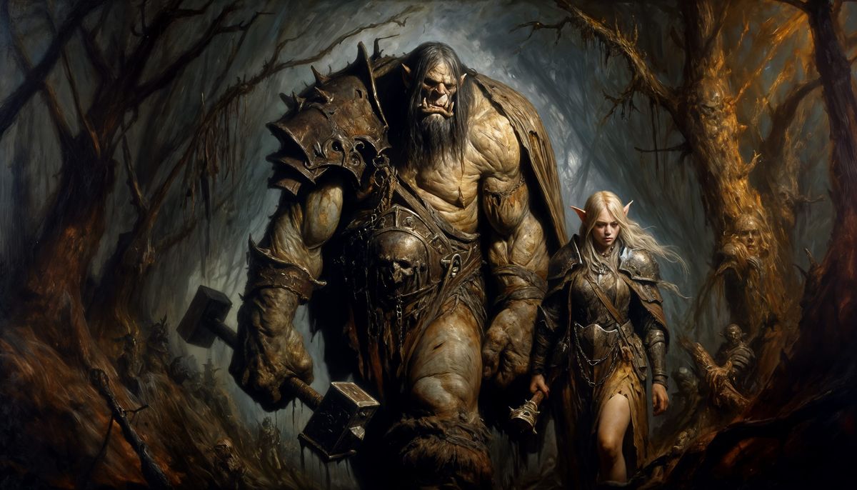 This image shows a robust ogre and a female elf walking side by side in a dark, gloomy forest, their medieval armor battered and grimy. The use of sfumato and chiaroscuro creates a dramatic, theatrical atmosphere.