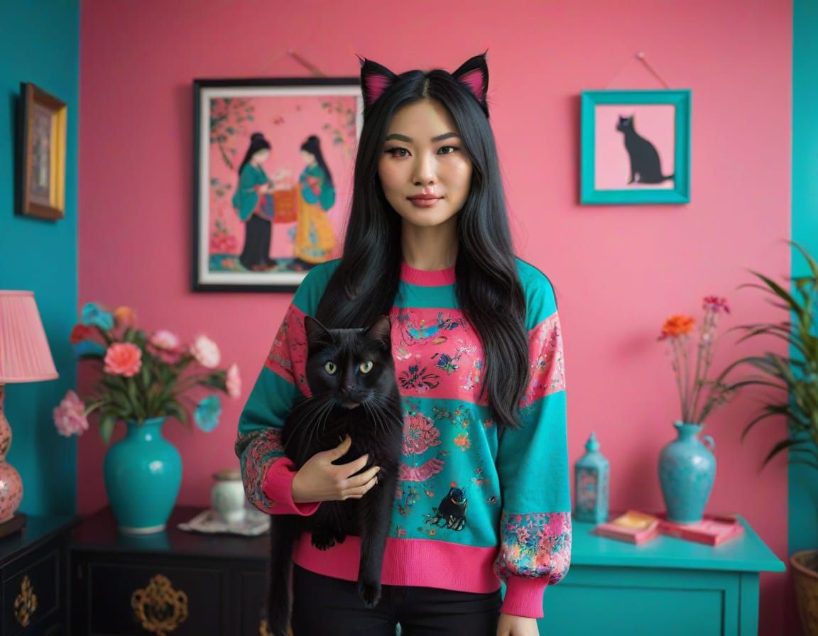 A vivid photo of an Asian woman with long, dark hair cradling a black cat. She's in a room decorated in pink and teal tones, wearing a playful cat-themed top.